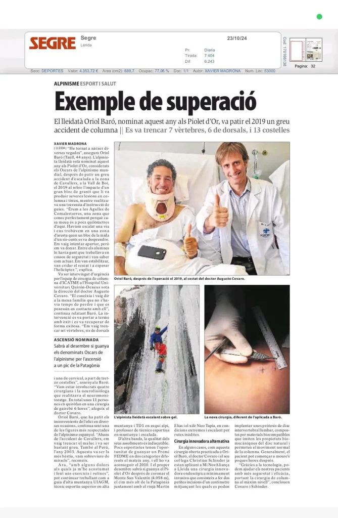 En octubre de 2019, el alpinista leridano Oriol Baró sufrió un grave accidente en las Agullas de Comalestorres (Vall de Boí) al recibir el impacto de un bloque de granito que le fracturó siete vértebras (seis dorsales y una cervical) y trece costillas. Tras estabilizarle en el lugar del rescate, fue trasladado de urgencia al ICATME–Hospital Universitari Quirón Dexeus, donde el Dr. Augusto Covaro y un equipo multidisciplinar llevaron a cabo la intervención inicial, combinando cirugía de columna abierta con neuromonitorización intraoperatoria.